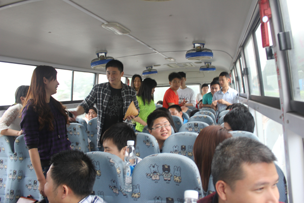 車漸漸的開起,兩位主持人在車開往高速路上時(shí),車平穩(wěn)了,人就活動(dòng)起來了,都踴躍參與其中,輸了那位同事10秒鐘吃一根香蕉,游戲火熱中···↓