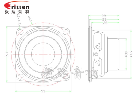 描述:方型鐵盆架橡膠邊紙盆內磁全頻53mm20芯8w藍牙音箱喇叭;