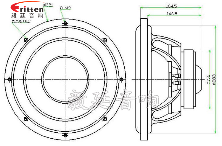12寸圓形塑料盆架外磁重低音喇叭,采用的是高性能鐵氧體,音色清晰、飽滿;