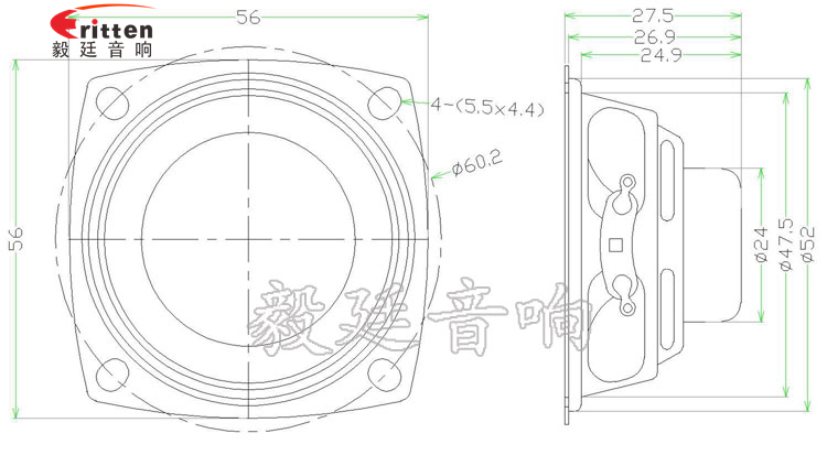 56mm異型鐵盆架內(nèi)磁全頻喇叭,具有穩(wěn)定的稀土高強磁,音色清晰、悅耳;